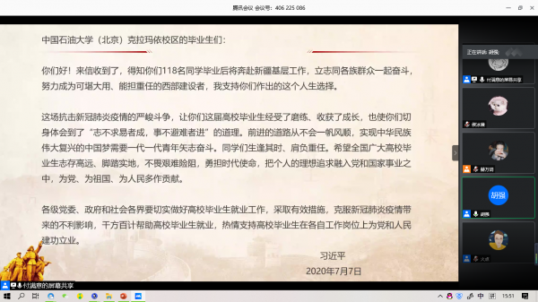 713日下午,林学院团总支学生会全体成员通过腾讯会议平台召开线上会议,集体学习了习近平给复旦大学《共产党宣言》展示馆党员志愿服务队全体队员的回信和习近平总书记给中国石油大学(北京)克拉玛依校区毕业生的回信。林学院教师付满意、胡强及全体团总支学生会成员参加本次会议,会议由胡强老师主持。