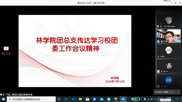 2020712日,林学院通过网络视频会议形式传达学习校团委工作会议精神。本次会议由付满意老师主持,胡强老师及学院团总支学生会部级以上成员和各班班长团支书参加。