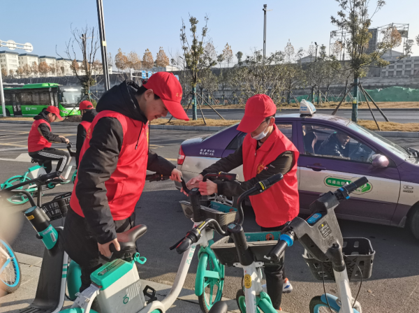 活动开始后,班委对班内人员进行分组,确定小组组长,并明确划分了相应的规整区域。每组成员都尽其所能,工作细致入微,不仅对单车进行规范的摆放,而且对沿途的垃圾进行了细致的清理。同学们也呼吁过往的群众文明骑行,爱护共享单车,将“文明共享,绿色出行”的健康理念传递出去。