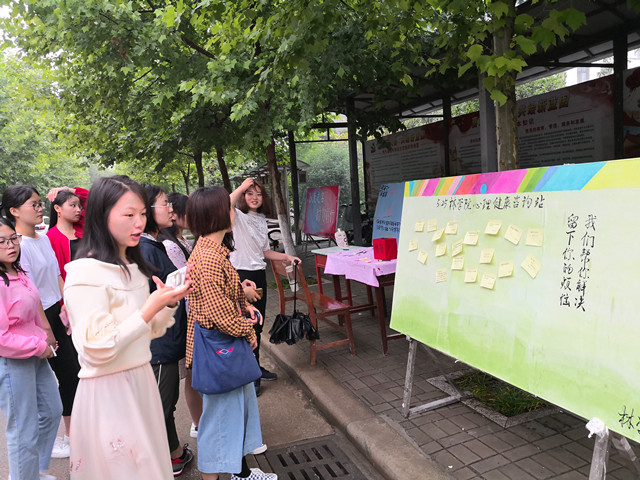 2018525日,林学院赵晶晶老师联合心理部同学在候车厅建立了心理健康咨询站。同学们在便利贴上留下自己想要咨询的心理问题和联系方式放入留言箱,之后根据他们的问题做出相应的解答和建议,给同学们带来心理健康问题上的帮助。
