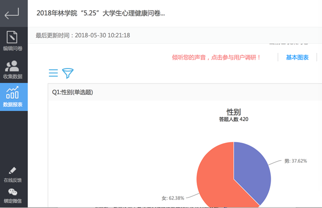 由各班辅导员及学生积极配合,通过问卷反馈的信息能够更直观和清晰的看出相关心理问题。本次问卷活动使我院的心理健康教育工作在被动等待学生前来咨询的基础上主动走近同学,让心灵阳光普照每一个同学,使更多的同学受益。