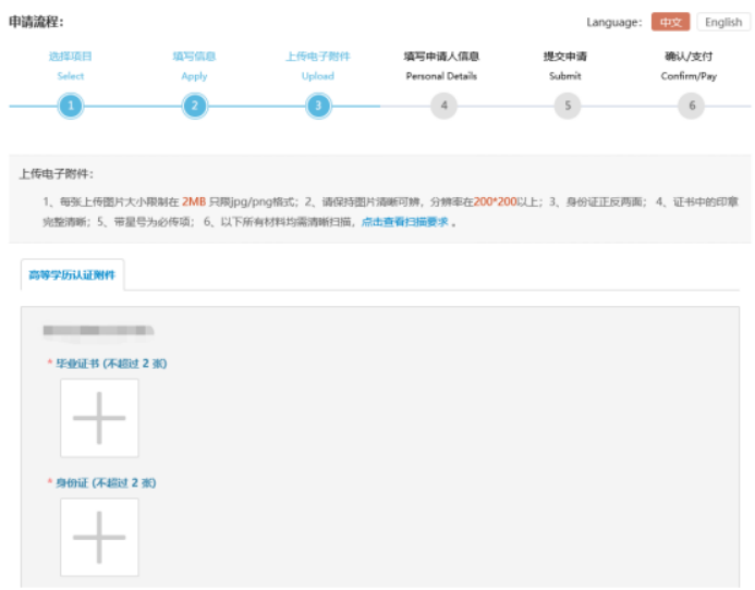 在接下来的页面里,按照申请流程添加学历并按照页面提示要求认真填写个人及毕业证书信息。