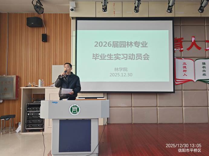 为切实做好2026届毕业生实习工作,明确实习要求,保障实习顺利开展,12月30日中午,林学院在一教E101教室召开园林专业2026届毕业实习动员会。林学院党委副书记范阳阳、副院长张广波、园林教研室主任刘秀青、毕业班辅导员及全体2026届园林专业毕业生参会,会议由刘秀青主持。