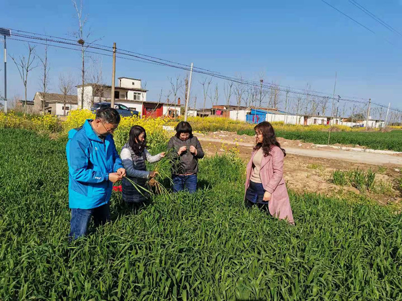 在潘滋亮副总的带领下参观了宏升公司的弱筋小麦种植基地,调查了郑麦819,郑麦817,郑麦518,杨麦113,杨麦13,杨麦30的生长情况和病虫害的发生情况,同时调查了有机弱筋小麦的种植模式,深入田间调查了有机种植弱筋小麦的长势,对比了有机种植弱筋小麦与常规种植小麦的长势差别,并与潘总交流了如何优化栽培管理模式、养分管理措施以及病虫害的绿色防控措施,提高弱筋小麦的产量和品质,同时,孙君艳向企业负责人保证,加强校企合作,促进乡村振兴,服务团将与企业共克弱筋小麦生产过程中的技术难题,加强技术联系,为宏升企业打造高标准弱筋小麦生产基地积极提供技术服务。