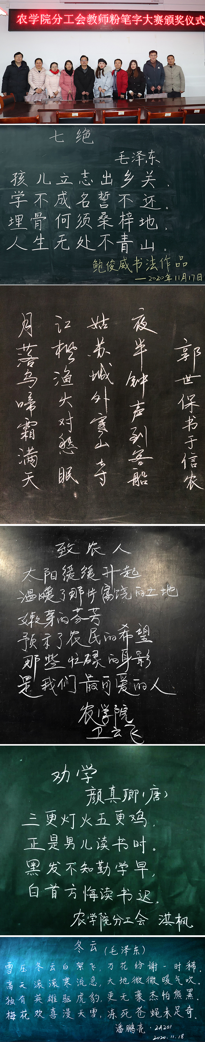 比赛前,学院要求采用黑板板书,选自中华古诗词等文学作品,时间规定10分钟,参赛开始后,教师准备充分,个个认真书写,能在规定时间内完成作品书写,他们书写的粉笔字有的遒劲有力,有的自然舒展,有的一气呵成,有的秀巧隽美,充分显示自己的水平,展现了我院教师深厚的写字功底。经过评选,最终鲍俊威和郭世保老师的粉笔字作品获得一等奖,卫云飞、洪枫、潘鹏亮和张方梅四位老师获得二等奖,其他选手为三等奖。学院院长尹健和党总支书记李传宝为获奖教师颁发了奖品。这次比赛,掀起了我院教师苦练教学基本功的热潮,同时为教师们搭建了一个相互学习与交流的平台,展现教师们的风采,也让教师们看到了别人的优点,对提升自身的综合素养、规范板书设计都有很大的促进作用。