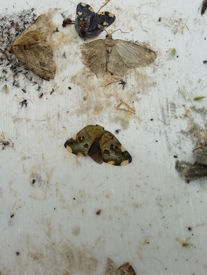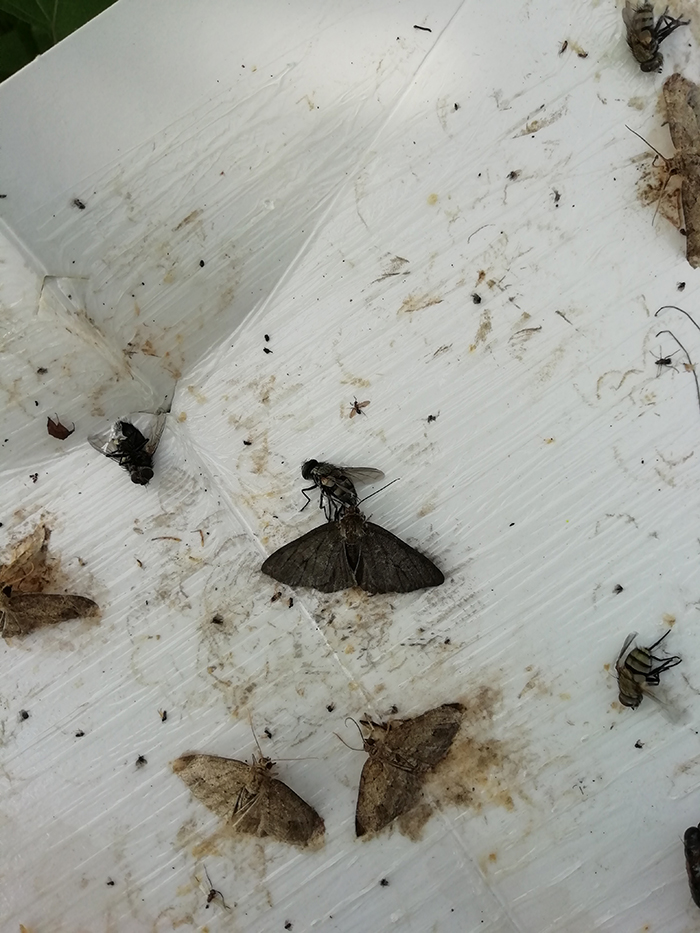 在调查中发现,茶园中蜡蝉成虫处于盛发期,目前茶园中主要有柿广翅蜡蝉、八点广翅蜡蝉、圆纹广翅蜡蝉、透明疏广蜡蝉、褐缘蛾蜡蝉和碧蛾蜡蝉等常见种类,并拍摄了一些蜡蝉成虫和若虫的生态图片,黄板上也诱集到了较多蜡蝉成虫,并带回实验室内统计数量。调查中还发现柿广翅蜡蝉产卵对油茶枝条为害较重,灰茶尺蠖的第四代成虫开始出现。受上几周的持续降雨影响,第二代茶毛虫发生量很少,基本不会对茶树构成危害。在申林茶园,因为上周采取了有效的防治措施,灰茶尺蠖幼虫危害情况已经明显减轻,部分茶树上可见到幼虫尸体。在亿峰茶园,上周喷洒了植物源农药苦参碱,导致茶小绿叶蝉、茶蚜等刺吸类害虫发生量减少。