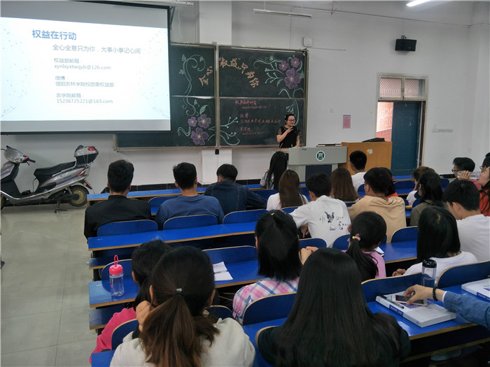 为增强我院学生的权益保护意识,2018年5月4日,农学院在一教E101教室举办“全心权益只为你”主题宣讲会。院学工组老师刘书含、学生会主席胡恒志、团总支副书记刘娟娟及各部部长出席此次活动,17级全体学生积极参加。