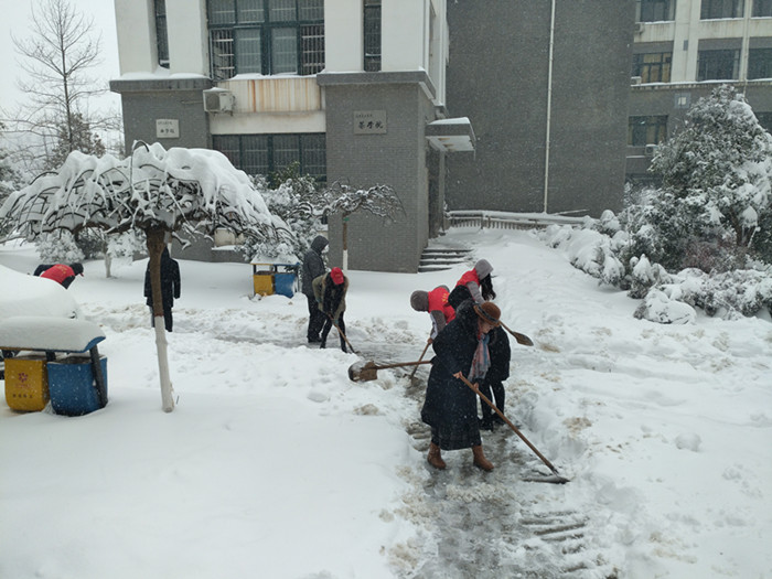 今冬的第一场雪比往年来的都要猛烈。一夜过后,雪堆积成厚厚的一层,道路突然消失了,师生出行极为不便。厚厚的积雪也让门前的树都弯下了腰,折断了枝干。2018年1月4日一大早,院长尹健带队,我院师生自发组成志愿服务队,进行2A实验楼周边路面积雪清理和树枝除雪。