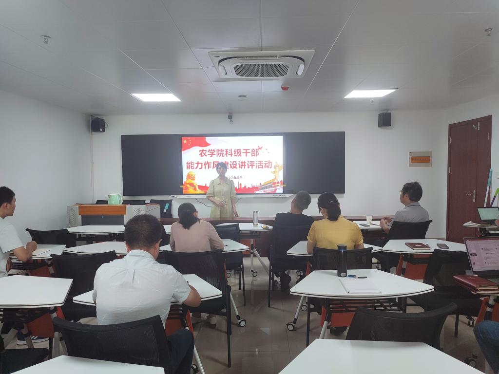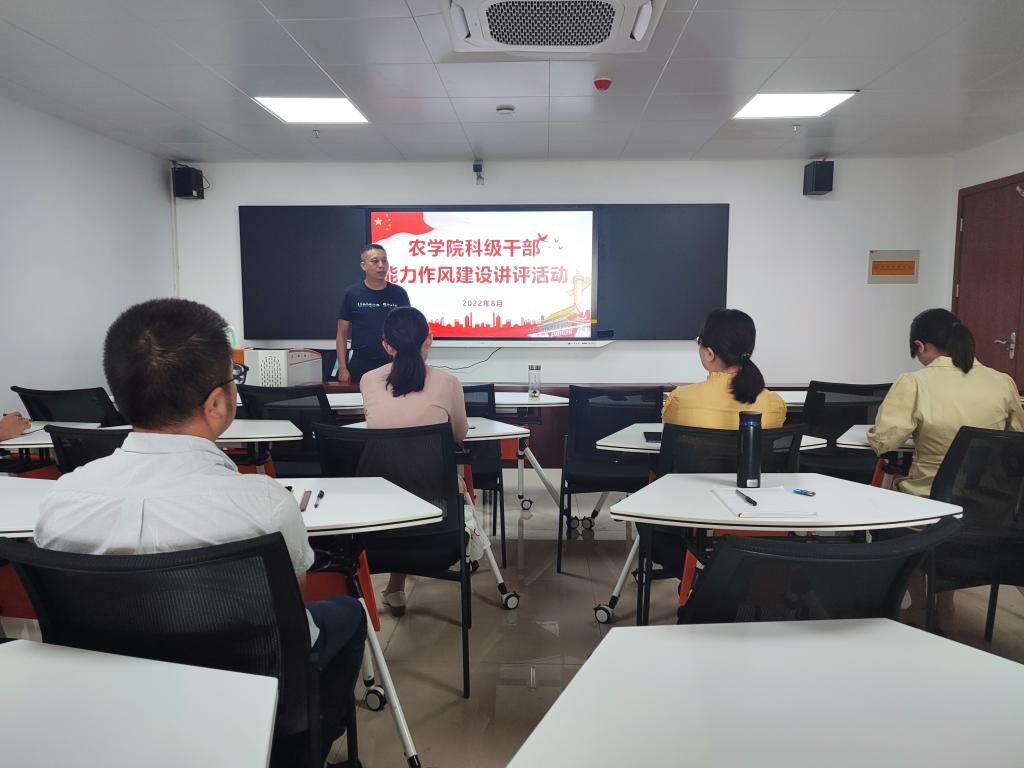 按照学校“能力作风建设年”的有关工作部署,为切实提升党员干部的工作能力、转变党员干部的工作作风,2022年8月10日,农学院党总支在会议室520进行了科级干部能力作风建设讲评活动。本次活动由院党总支书记李传保同志主持,农学院全体科级及以上干部参与了本次讲评。