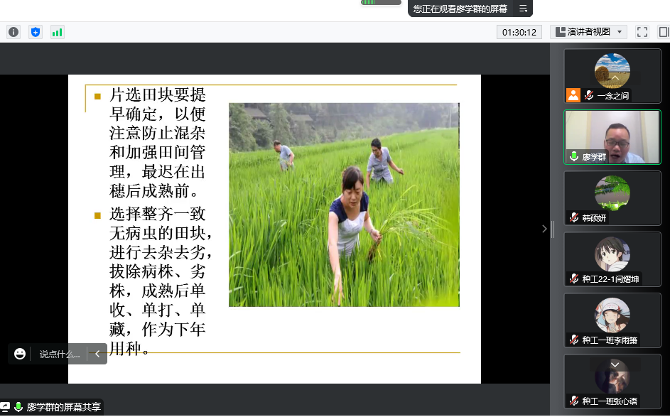 廖学群高级农艺师的报告内容结合生产实践,十分接地气,报告加深了学生对常规稻品种选育工作的认识,拓宽了参会师生的专业知识,激发了学生对水稻育种事业的兴趣。