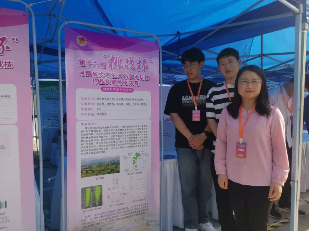 5月10日至5月14日,由共青团河南省委、河南省教育厅、河南省社会科学院、河南省科学技术协会、河南省学生联合会主办,华北水利水电大学承办的第十六届“挑战杯”河南省大学生课外学术科技作品竞赛终审决赛在华北水利水电大学龙子湖校区举行。我院乔利老师指导的“四种药剂对小贯小绿叶蝉的取食刺吸电位分析”作品通过校内选拔、专家初审,作为学校唯一作品入围决赛。乔利老师、陈磊老师带领学生岳双奇、路航参加作品海报展示、评审答辩环节。