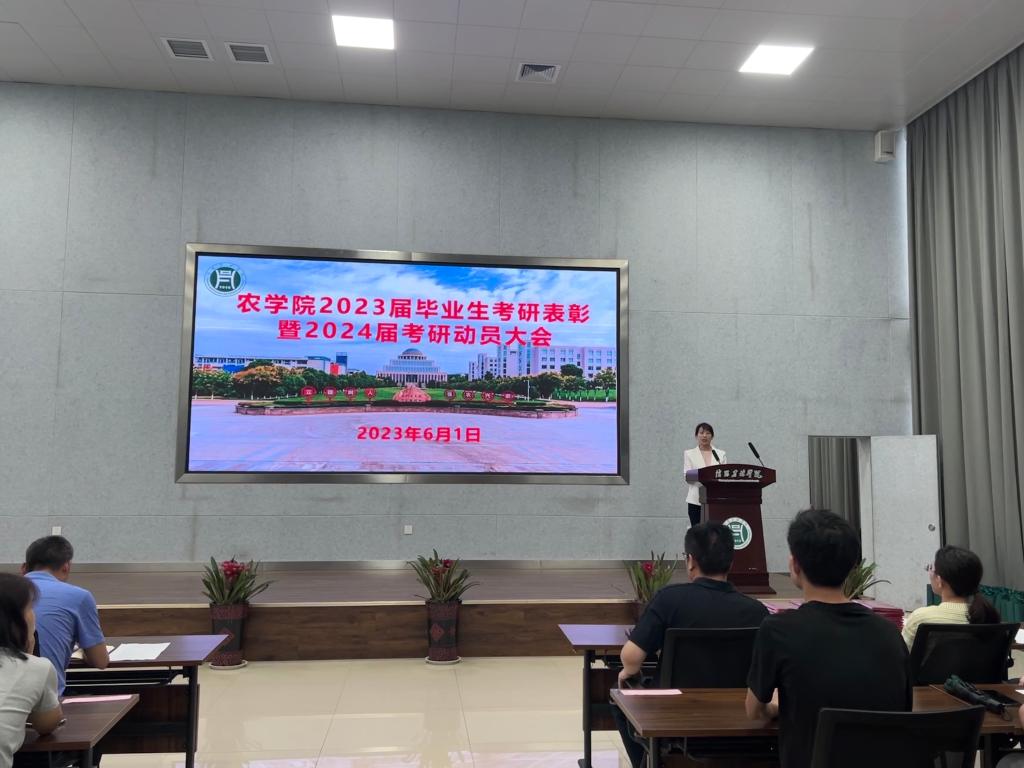6月1日上午,农学院在学术交流中心一楼多功能报告厅召开2023届毕业生考研表彰暨2024届考研动员大会。学院党总支书记李传保、院长尹健,副院长陈利军及董丽平,团总支书记陈磊,种子科学与工程教研室主任李淑梅、农学教研室主任卫云飞,毕业班辅导员季新、郭世保、金银利及2019级、2020级学生共200余人参加本次活动,会议由院党总支副书记王付娟主持。
