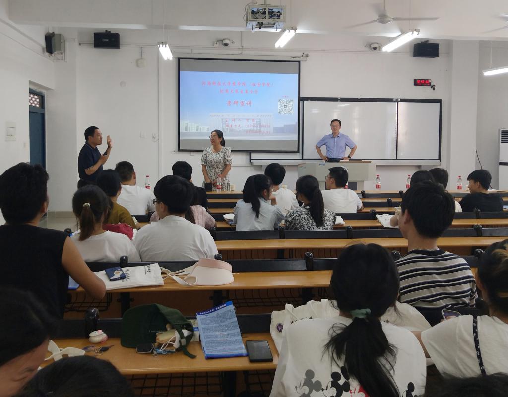 为帮助我院学生了解考研形势,调整备考状态,明确考研目标,2023年7月10日下午在2教116,河南科技大学农学院副院长宋鹏、研究生秘书宋程伟,辅导员张茹佳老师一行3人在2教116为我院2024届学生做考研宣讲会。会议由学院副院长董丽平主持,农学院专业教师张莉、刘娟及部分2024届毕业生参加。