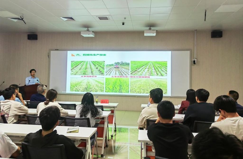 赵全志教授首先介绍了开展粮饲型再生稻研究的意义,以及新型再生稻发展的过程与优点,随后着重阐述了粮饲双优双高栽培技术的品种选择,刈割时期和留茬高度,种植密度和施肥量以及全程机械化的探索。赵全志教授认为发展粮饲结合新型再生稻,是探索一条在保障粮食基本不减产的情况下,多收获一季优质饲草的新路子;提高再生稻的产量和品质,可有效缓解南方稻区畜牧业发展所需饲草与粮食生产争地的严峻形势,增加稻农综合效益,实现粮饲统筹,对于保障国家粮食安全、解决南方食草动物饲料来源具有重要意义。同时,赵全志教授还介绍了新型再生稻品质“淀粉分子结构-理化性质-稻米品质”构效关系的最新研究成果。此外,赵全志教授还与我院青年教师分享了国家自然科学基金的写作与申报技巧:要坚持问题导向寻找科学问题,形成特色学术思想,充分利用先进技术,精雕细刻申报书。