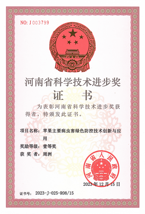 近日,河南省人民政府发布《河南省人民政府关于2023年度河南省科学技术奖励的决定》(豫政〔2023〕41号),我院周洲教授参与完成的成果《苹果主要病虫害绿色防控技术创新与应用》荣获河南省科学技术进步奖一等奖。项目由河南农业大学尹新明教授主持,针对我省长期依赖、过量使用化学农药防治苹果病虫害带来的果品农药残留、病虫害抗药性上升和果园环境污染等实际情况,开展苹果病虫绿色防控关键技术研究与应用。坚持规律研究、病虫监测、技术研发和集成推广同步进行,相互促进。通过实验研究和系统监测,为防治决策提供依据;开展绿色防控技术产品研发、通过应用试验示范明确绿色防控技术的适用性、局限性,集成全生育期病虫绿色防控技术体系。通过建立绿色防控示范区,依托新型农业主体,探索技术推广模式,开展多种形式技术宣传和培训,辐射带动周边区域技术推广。(撰稿/周洲)