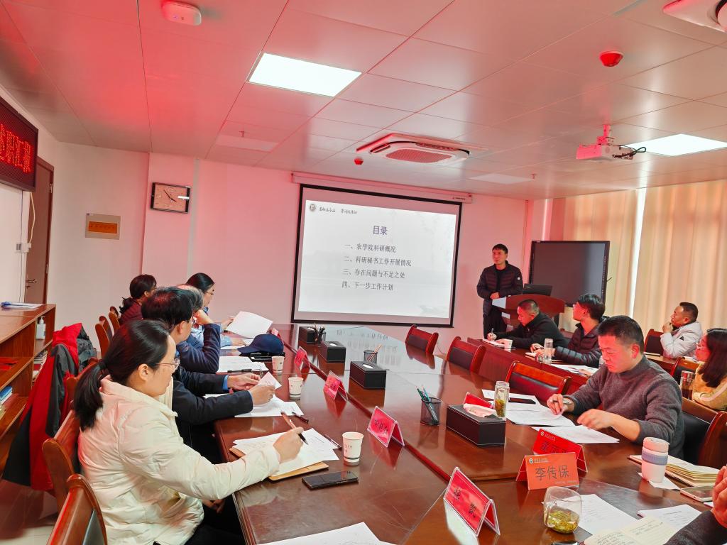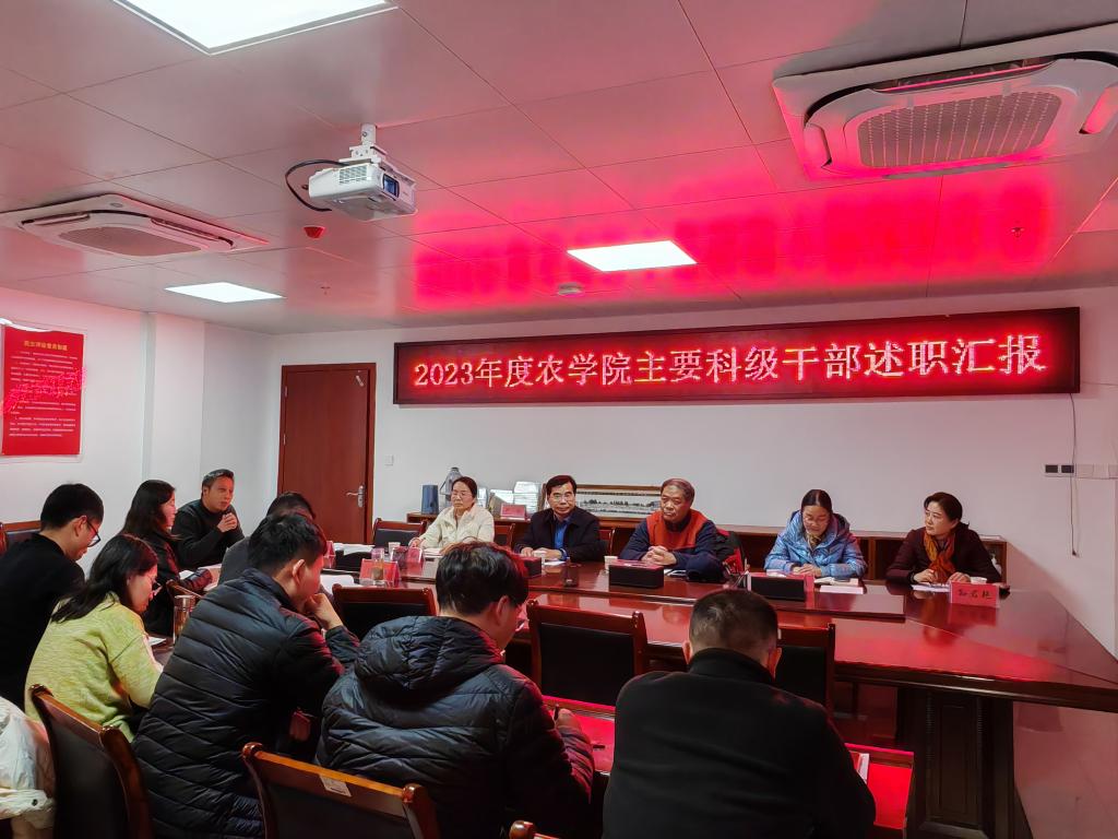 为全面总结我院2023年工作,并对2024年各项工作开展挖掘新思路、找准新方法,进一步增强科级干部履职尽责的能力,充分调动大家干事创业的主动性、积极性,更好地推动2024年农学院各项工作迈上新台阶,2024年1月10日,我院在学术交流中心626召开2023年度科级干部述职报告会及学科专业建设座谈会。会议分两个阶段进行,分别由我院党总支书记李传保及院长陈利军主持,副院长董丽平和全体科级干部参加。会议特邀原农学院党总支书记胡孔峰教授、原科技处处长史洪中教授、中心实验室主任喻艳红、图书馆党总支书记张淮、学报编辑部主任孙君艳参加。