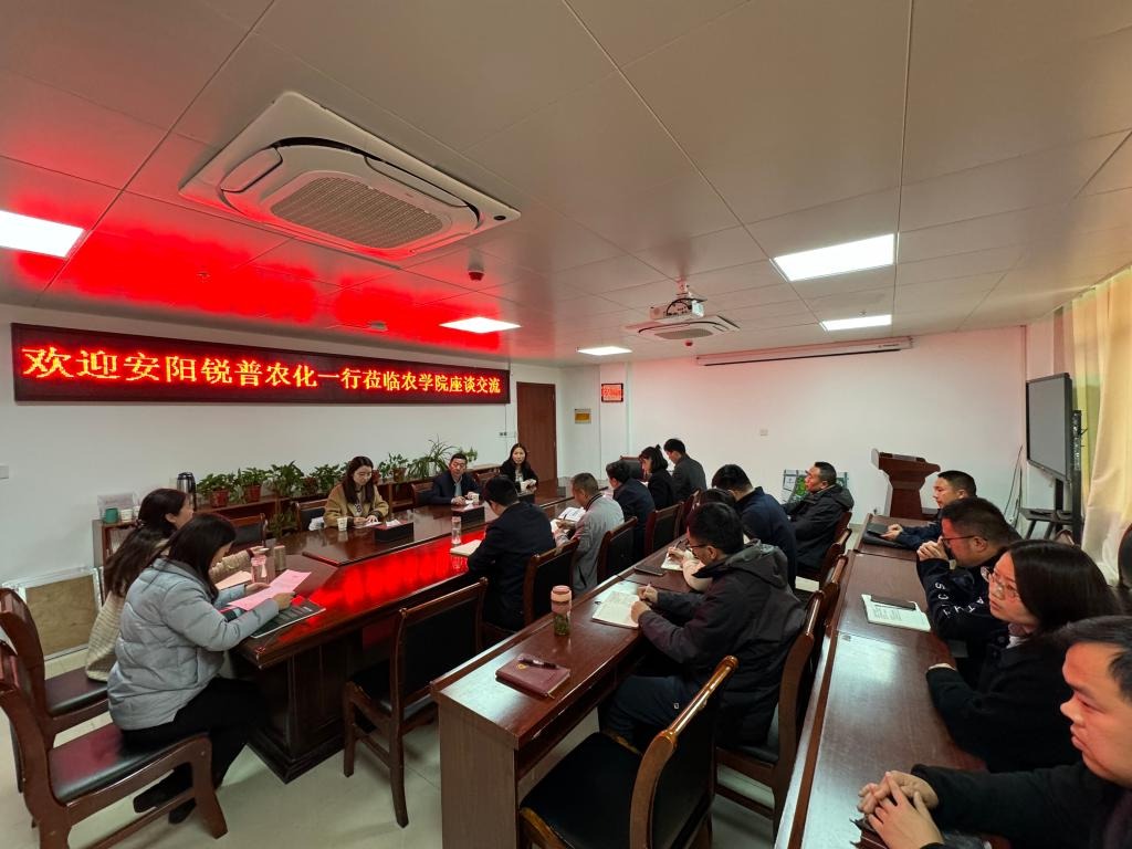 3月26日,安阳锐普农化有限责任公司常务副总郭齐、办公室主任杨素菊和人事部经理李雨洛一行三人受邀到我院召开校企合作座谈会。学院全体班子成员及各教研室主任、副主任和就业专员、团总支书记参会,会议由副院长董丽平主持。