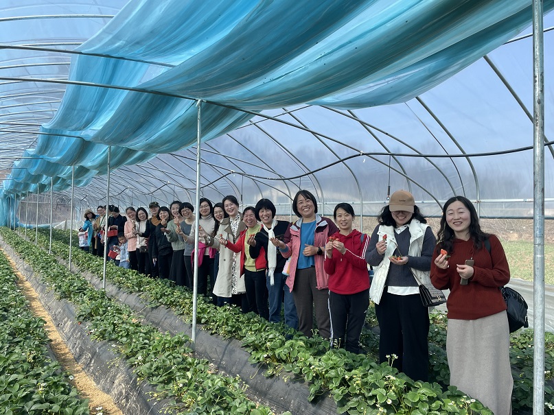 活动伊始,分工会主席王付娟向全体女教职工致以最诚挚的祝福,并对今后的工作与生活寄予美好的祝愿。随后,教师们纷纷走进草莓基地,小心翼翼地行走在草莓垄之间,闻着浓浓的草莓果香,在绿枝丛中寻找“藏匿”的红艳果实,有的老师一边采摘一边拍照定格美好瞬间,并互相交流着关于如何制作草莓酱等方面的知识。有的老师品尝着甜甜的草莓,感受学院的关怀,工作中的烦恼一扫而空。有的老师带孩子参与其中,寓教于乐中为孩子带来一堂生动的实践教育课。活动中欢声笑语不断,洋溢着轻松和谐的氛围,每个人都有了丰硕的成果。