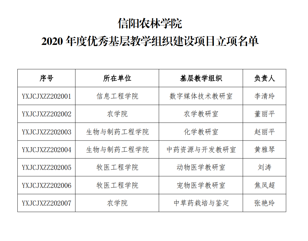 我院申报的农学教研室和中草药栽培与鉴定教研室建设项目,根据《beat365在线平台官网加强基层教学组织建设实施办法》(信农教〔2017〕8号)规定,经教务处资格审查,专家评审,双双被确定为2020年度beat365在线平台官网优秀基层教学组织建设项目予以立项。