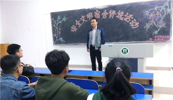 为了增强当代大学生的安全卫生意识,养成良好的安全卫生习惯,共同维护宿舍环境,2019年4月2日,我院在一教a104举办安全文明宿舍评选活动。院生活部干事吴晓晴同学担任本次评选活动的主持人,学工组武浩老师出席本次活动,18级各班生活委员、安全委员、女生委员及文明宿舍代表同学参加。
