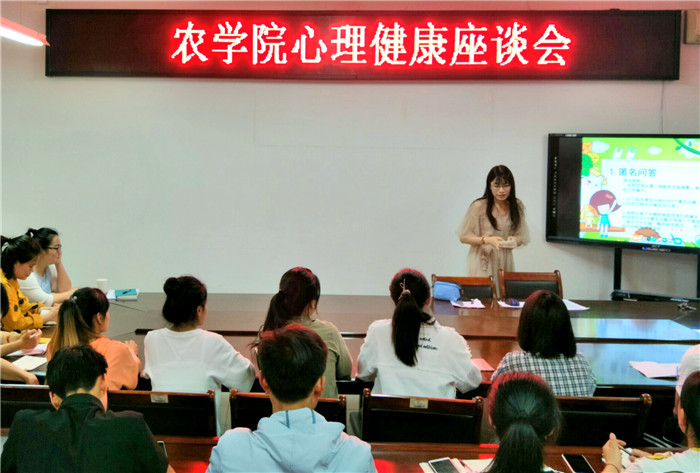 会上杜老师就前期农学院同学提出的匿名问题进行了汇总,邀请同学们分组讨论九个问题的答案,尝试自己给出答案。同学们经过讨论,积极发言,对九个问题发表自己的观点和提出自己的解决思路。杜老师用小礼品鼓励了积极回答问题的同学,对同学们的回答进行了认真的分析并给出了经过查阅资料等科学分析后的思考方式和做法,向同学们推荐了心理游戏软件,座谈会气氛活跃。现场提问环节同学们积极提问,问出了大学生活里的各种困惑,并向杜老师了解了心理中心的位置与情况。杜老师从容作答,鼓励同学们保持积极乐观的心理状态,不虚度大学时光。