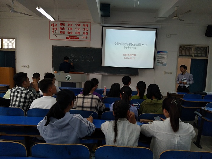 詹院长一行在一教A105对我院学生做了研究生招生宣传,农学院种子科学与工程、农学专业16级及部分17级学生参加了本次活动。詹院长向学生介绍了安徽科技学院及农学院的基本情况。舒英杰教授及李树成博士就该校研究生招生情况及政策向学生进行了介绍。并就研究生研究方向设置、奖学金设置、培养情况向学生进行了答疑。