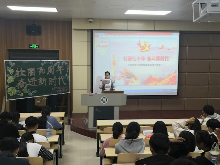 2019年10月18日晚,我院在二教204举办以“壮丽70周年奋进新时代”为主题的演讲比赛。本次演讲由沈一航、司加欣担任主持人,组织部同学担任评委,19级同学参加。