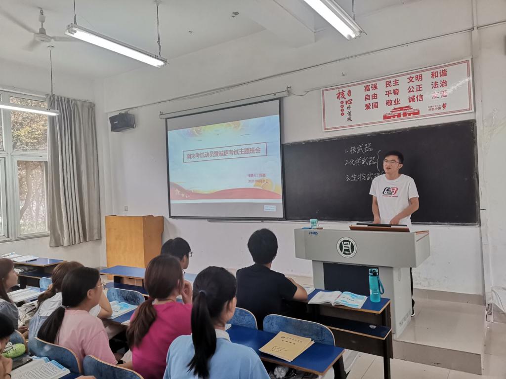 会上,各班辅导员向同学们强调了诚信考试的重要性,带领同学们学习了《学生制度汇编》关于考试违规违纪相关处理办法,鼓励大家在学期末关键时期,调整心态,认真备考。随后,辅导员们向学生讲解了“5+x”暑期实践的具体要求,强调了假期安全以及疫情常态化意识,并就假期离校、返校安全注意事项进行了说明。