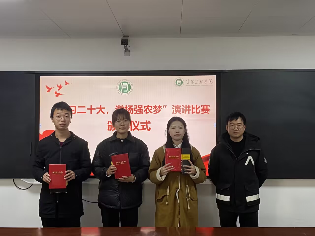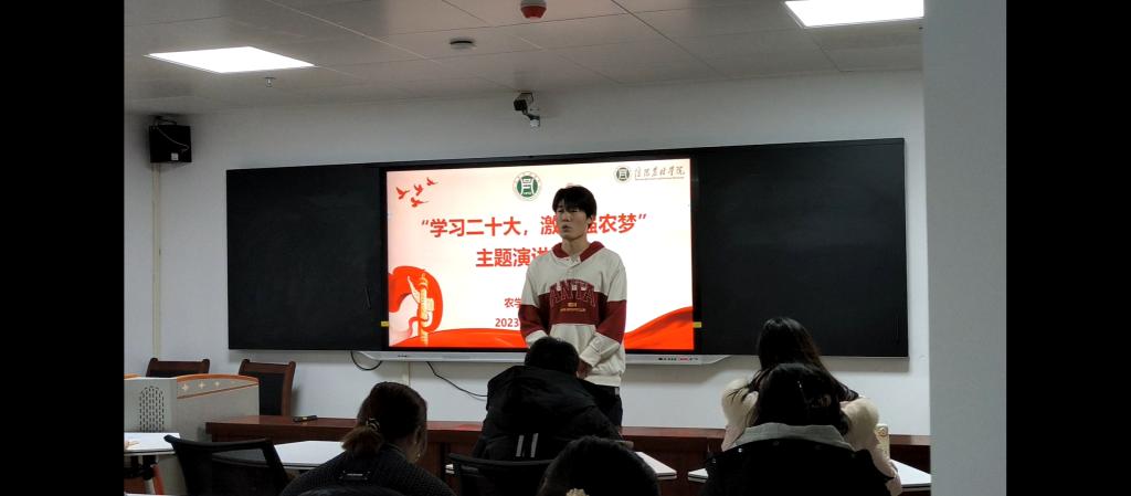 2023年11月27日晚,农学院团总支在学术交流中心520室举办以“学习二十大,激扬强农梦”为主题的演讲比赛,本次活动邀请我院团总支书记陈磊、学工组杨春玲老师、李敏博士、冯凡博士担任评委。