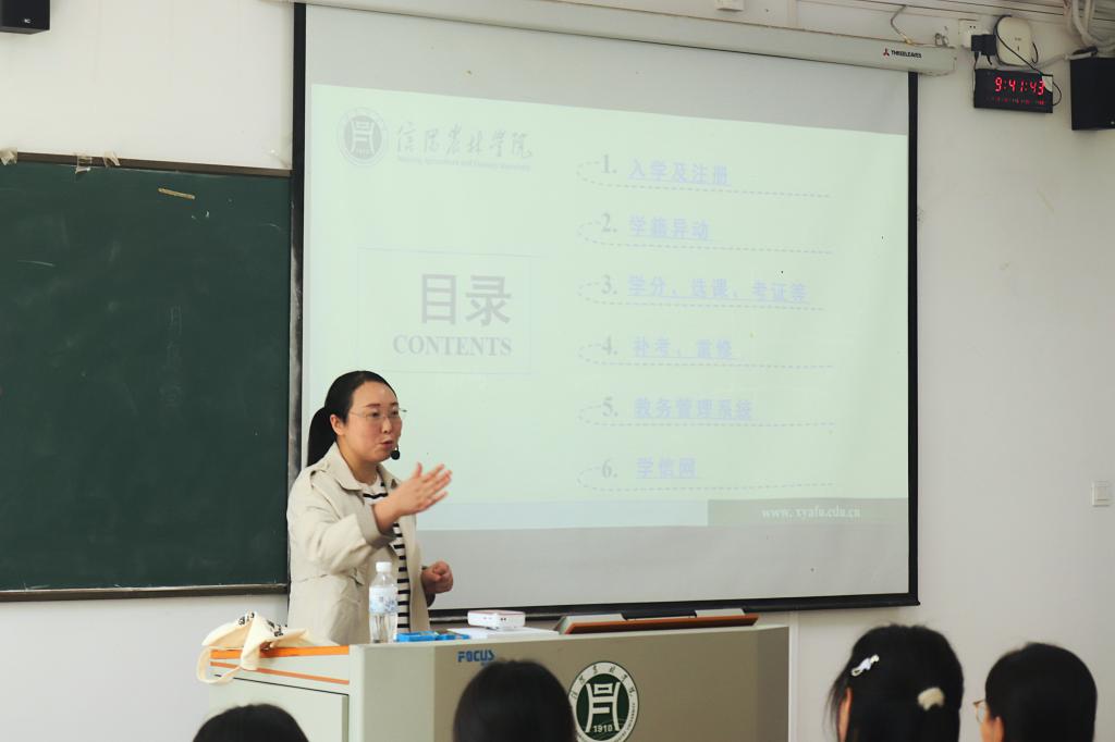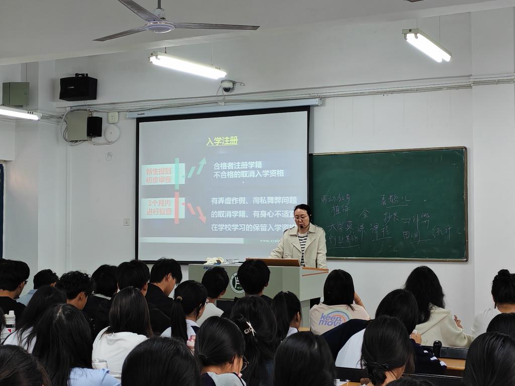 培训会上,学院教学秘书金银利首先向新生介绍了入学及注册流程。强调新生需在规定时间内完成报到、注册手续,以确保学籍信息的准确性。随后,详细讲解了学籍异动的相关规定,包括休学、复学、转专业等手续办理流程,提醒新生在学籍异动过程中要遵循规定,确保学籍信息无误。