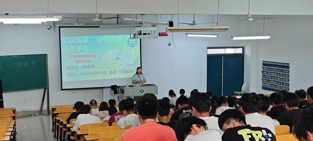 暖风细雨润心田,资助政策暖校园。学以载道,心怀感恩,诚信于心。为深入贯彻落实国家资助政策,进一步加强新时代大学生诚信、感恩教育,提升毕业生助学贷款的还款意识,帮助毕业生明晰还款流程与责任。2025年5月27日中午,农学院在二教306开展2025届贷款毕业生之诚信还款、感恩教育宣讲会,讲座由学院资助专员杨春玲主持,2025届全体贷款毕业生及其他非毕业班学生参会。