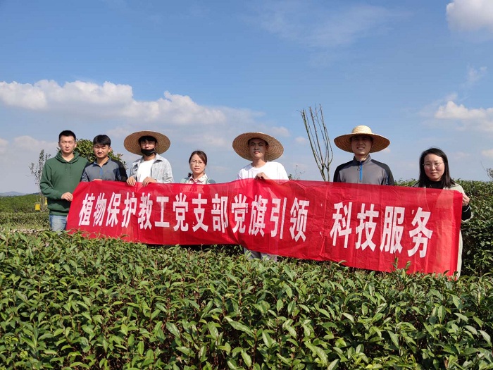 2020年10月9日下午,植物保护教工党支部的乔利、耿书宝和金银利三位教师党员以及教研室潘鹏亮博士,带领四名2017级植物保护专业学生到罗山县亿峰生态林业开发有限公司和申林茶业开发有限公司茶园开展害虫发生调查。