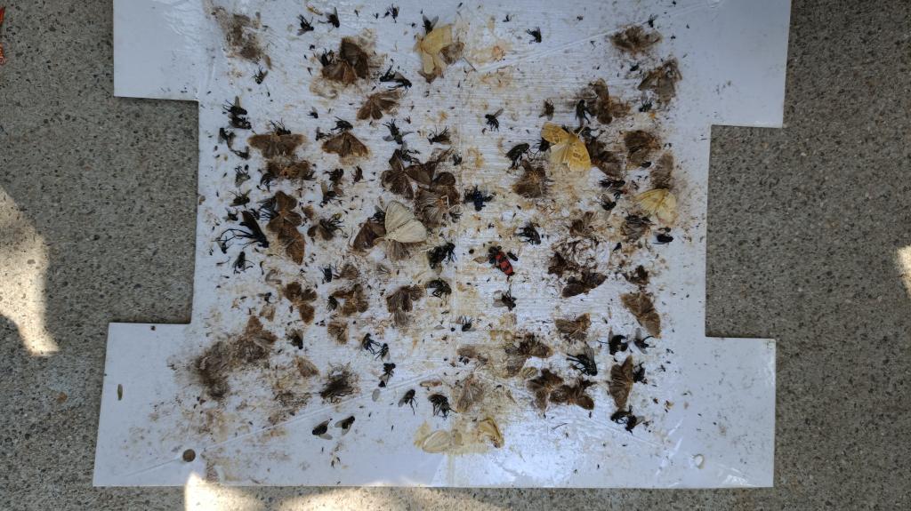 耿博士带领学生检查了灰茶尺蠖、茶蚕、茶细蛾、茶毛虫的性信息素诱捕器,指导学生识别常见的茶树害虫,更换诱捕器粘板,培养学生的科研能力和实践创新能力。通过本周的调查,发现茶细蛾成虫发生量进入高峰期,平均每个诱捕器有200多头,茶毛虫的发生量也开始增多,灰茶尺蠖成虫发生量很少。茶蚕尚未诱集到,但是在茶蚕诱捕器中发现了10头左右的茶毛虫。此外,在茶园还观察到铃木窗蛾、小绿叶蝉、茶蚜、碧蛾蜡蝉、褐缘蛾蜡蝉若虫等,还有螳螂、蜘蛛等天敌。耿老师带领学生坚持进行茶园害虫的调查和监测,为茶园病虫害监测预警与绿色防控提供数据支撑。