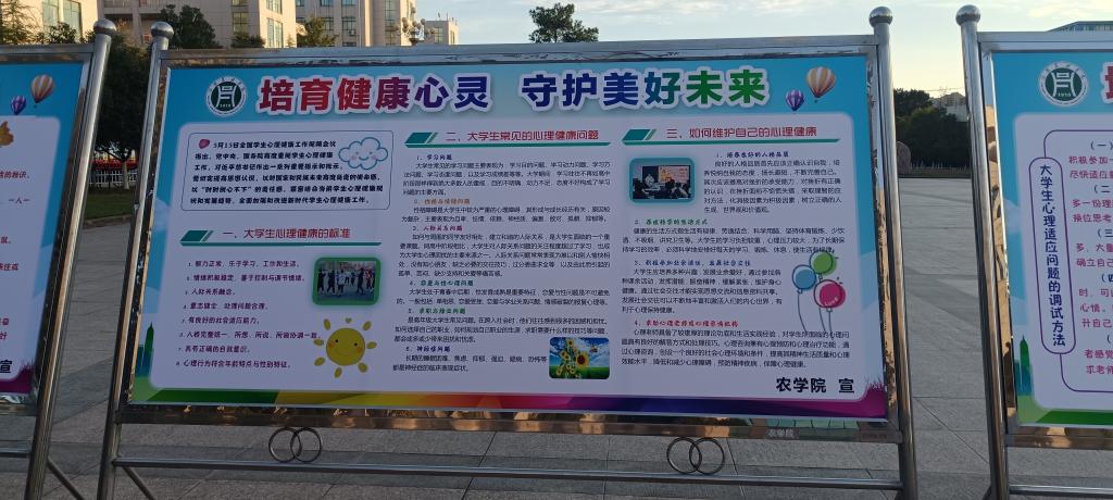 我院展示了:一、大学生心理健康的标准;二、大学生常见的心理健康问题;三、如何维护自己的心理健康。