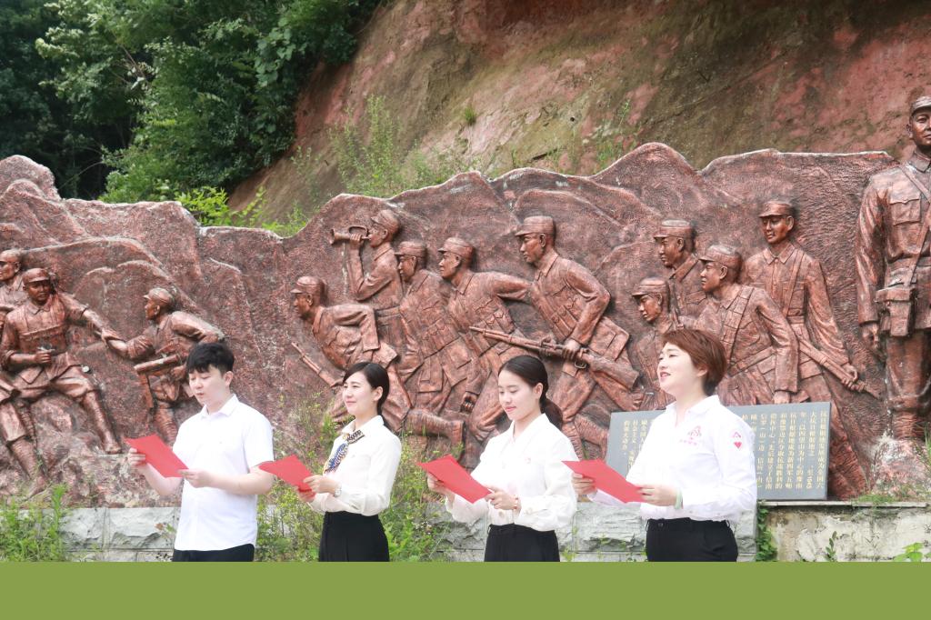 大家先后参观了四望山会议旧址、新四军五师指挥部、李先念办公室等红色纪念地,重温红军长征革命历史,缅怀革命先辈的丰功伟绩,缅怀老一辈的革命情怀。站在四望山红色革命纪念广场雕塑面前,全体师生党员在陈建国的带领下面向党旗重温入党誓词,场面庄严肃穆,在洪亮的誓言中坚定理想信念,坚守入党初心。教师代表于洋、王芳、付静宇、易冉在新四军五师指挥部旧址的革命英雄浮雕墙前进行了题为“永远跟党走,奋进新时代”的诗歌朗诵,抒发对党和祖国的热爱以及对未来幸福生活的畅想。学生党员代表先后为大家讲解了李先念等革命先烈们的英雄故事,表达了对革命先烈们最崇高的敬意。