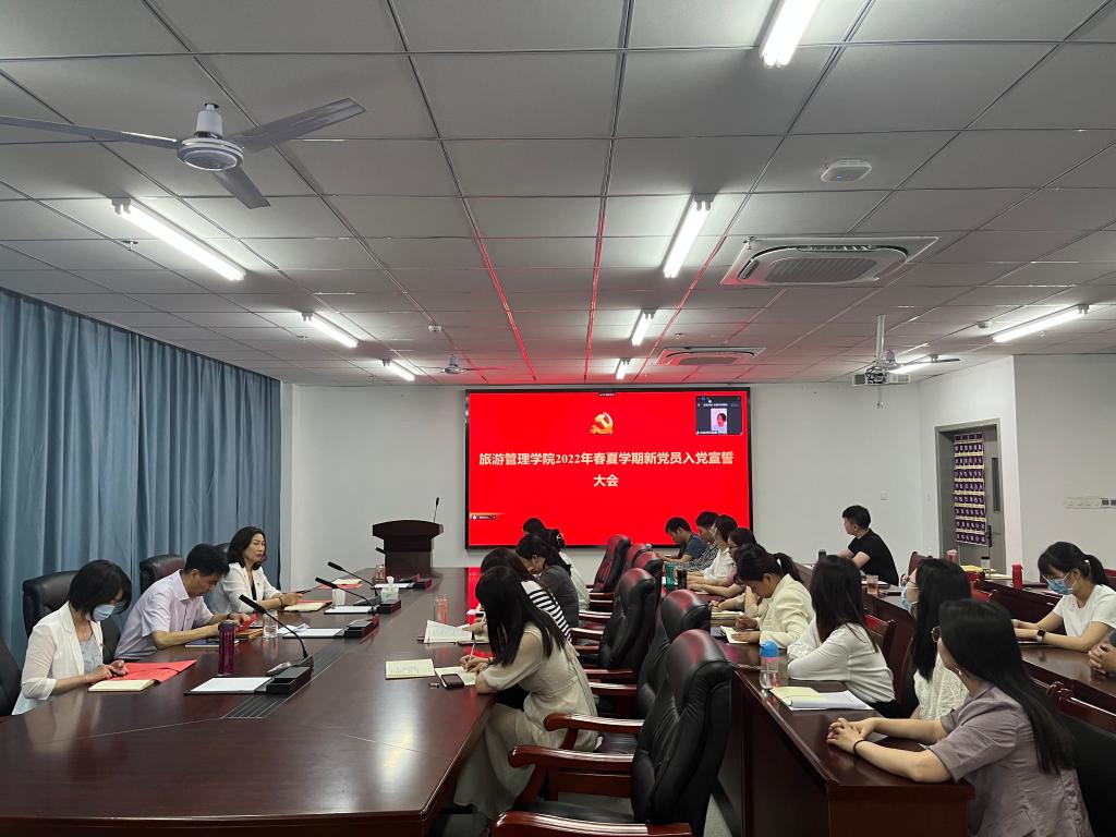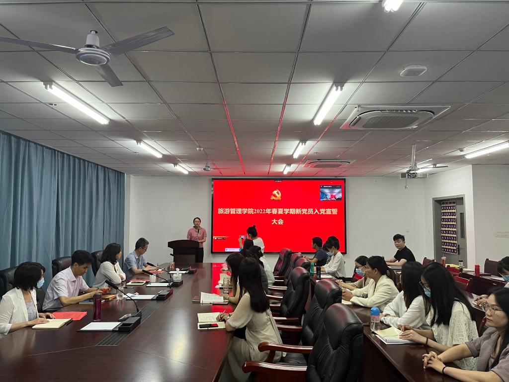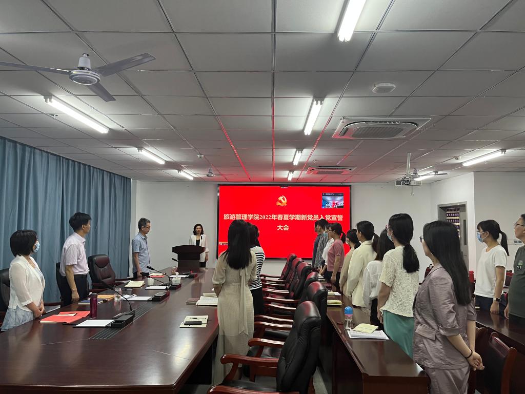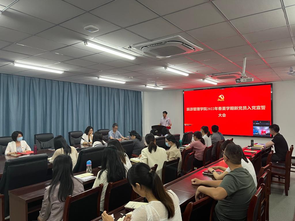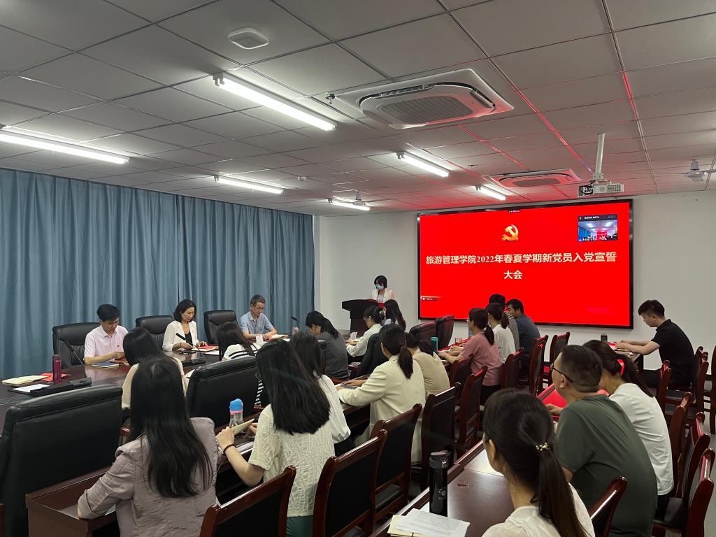 为加强党员思想引领,强化党员责任担当意识,旅游管理学院党总支于6月14日在双创中心310举行2022年春夏学期新党员入党宣誓大会活动,入党宣誓仪式采用线上线下同步的方式进行。学院院长刘开华,党总支副书记杜丽,副院长陈婷、余兵,各支部支委、新发展师生党员和入党积极分子参与活动。活动由杜丽主持。