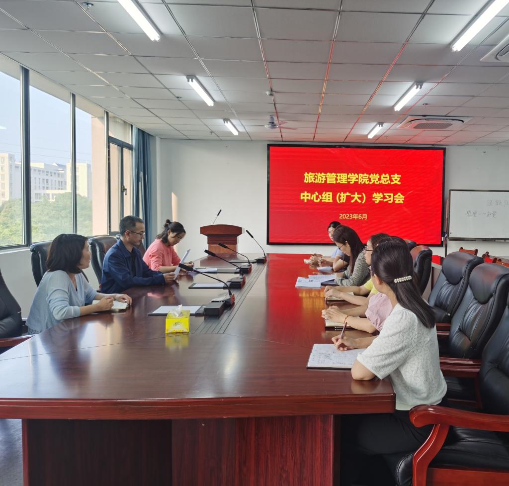 6月13日下午,旅游管理学院党总支在双创中心310会议室召开中心组(扩大)学习会。会议由党总支副书记杜丽主持,学院班子成员参加会议,院科级干部及各支部书记列席。