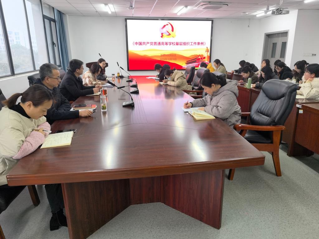 为深入学习贯彻习近平新时代中国特色社会主义思想,全面落实新时代党的建设总要求,旅游学院党总支于12月10日组织开展了《中国共产党普通高等学校基层组织工作条例》(以下简称《条例》)专题学习。本次学习由党总支书记朱长明主持,全体党员参会。