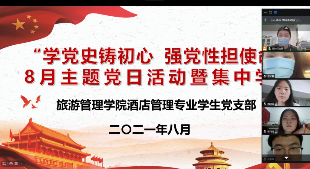 为深入学习贯彻习近平新时代中国特色社会主义思想,进一步加强师生党史学习教育,传承红色基因,赓续红色血脉,8月13日,旅游管理学院酒店管理专业学生党支部在线上开展了“学党史铸初心,强党性担使命”8月主题党日活动,酒店管理专业学生党支部党员及部分入党积极分子参加了此次活动。活动由党支部书记周诗涛主持。