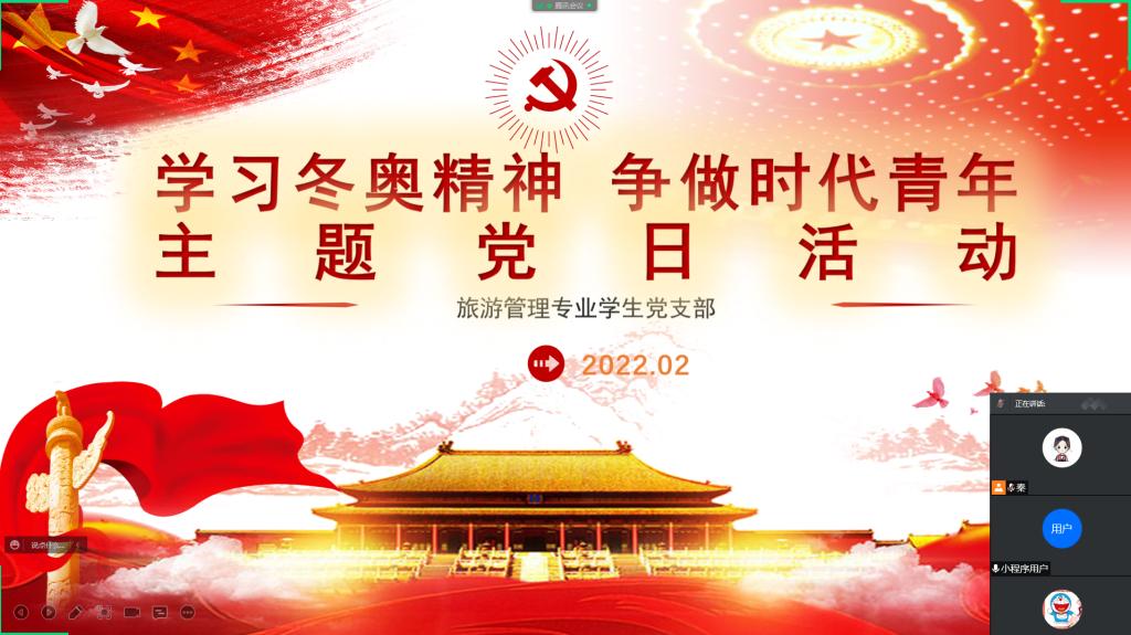 2月20日,旅游管理专业学生党支部在线上开展了“学习冬奥精神 争做时代青年”2月主题党日活动,活动由支部书记徐晓琰主持,支部全体党员参加了此次活动。