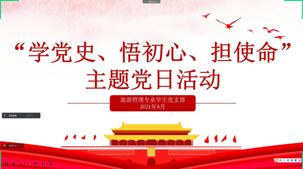 为深入学习贯彻习近平新时代中国特色社会主义思想,进一步加强师生党史学习教育,传承红色基因,赓续红色血脉,2021年8月13日,旅游管理专业学生党支部在线上开展了“学党史、悟初心、担使命”8月主题党日活动,活动由支部书记徐晓琰主持,支部全体党员参加了此次活动。