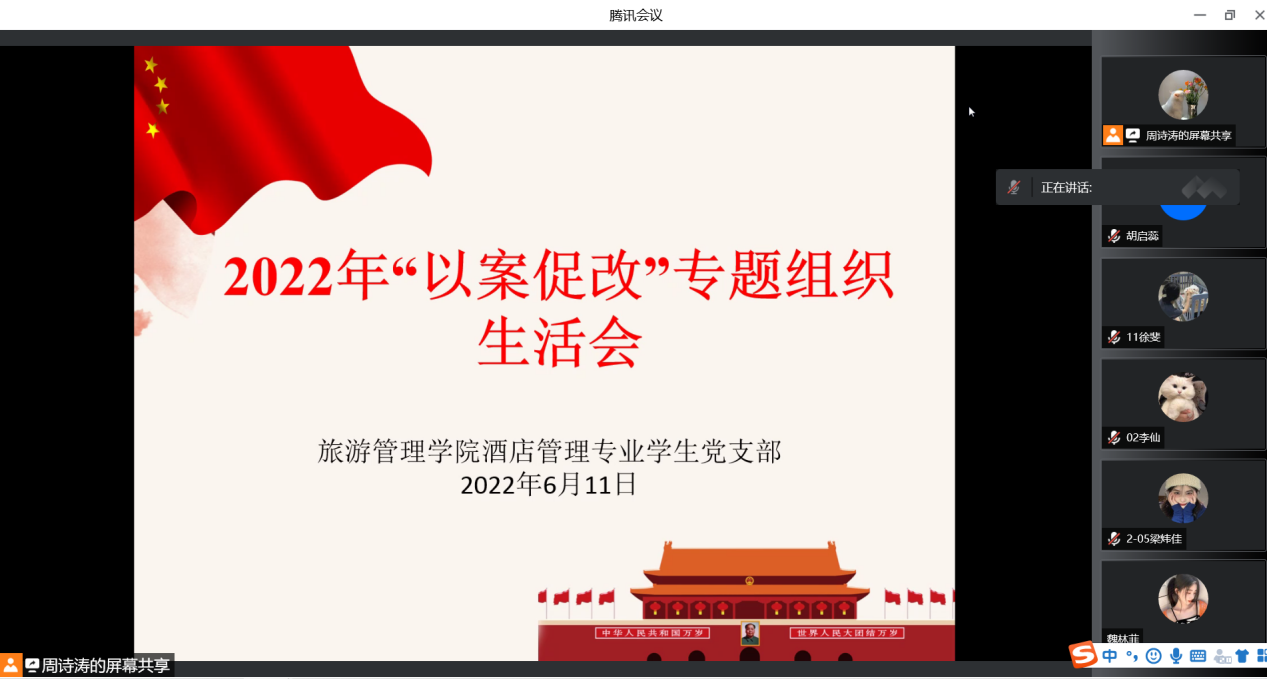 6月11日下午,酒店管理专业学生党支部在线上召开“以案促改”专题组织生活会,会议由支部书记周诗涛主持。
