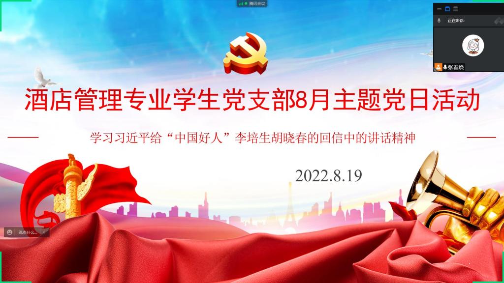 8月19日,酒店管理专业学生党支部线上开展了以“学习中国好人强化责任担当”为主题的八月份党日活动,会议由支部书记张春焕主持。