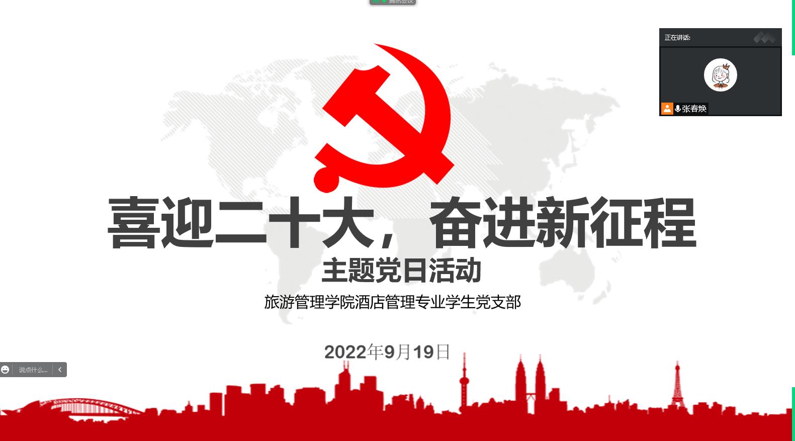 9月19日,酒店管理专业学生党支部线上开展了“喜迎二十大 奋进新征程”为主题的党日活动。会议由支部书记张春焕主持。