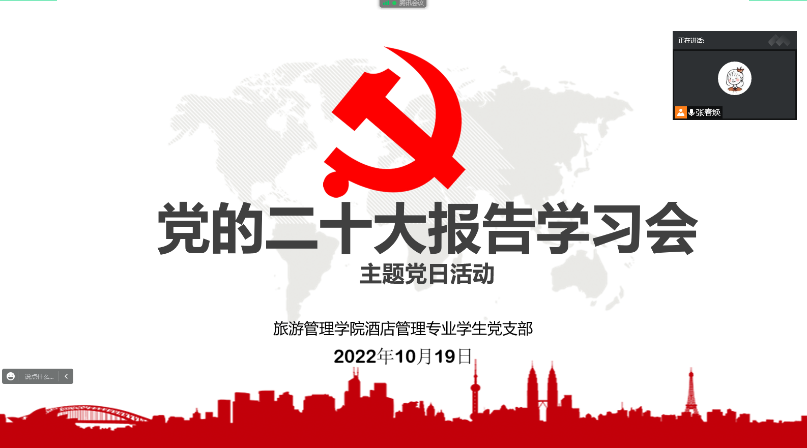 10月19日,酒店管理专业学生党支部线上开展了以“党的二十大报告学习会”为主题的党日活动。会议由支部书记张春焕主持。