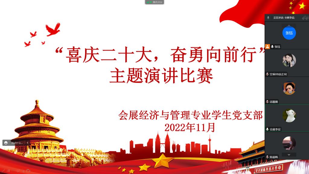 为强化对青年党员的思想政治引领,会展经济与管理专业学生党支部于11月23日线上开展了以“喜庆二十大,奋勇向前行”为主题的演讲比赛,支部全体党员参加了此次比赛。
