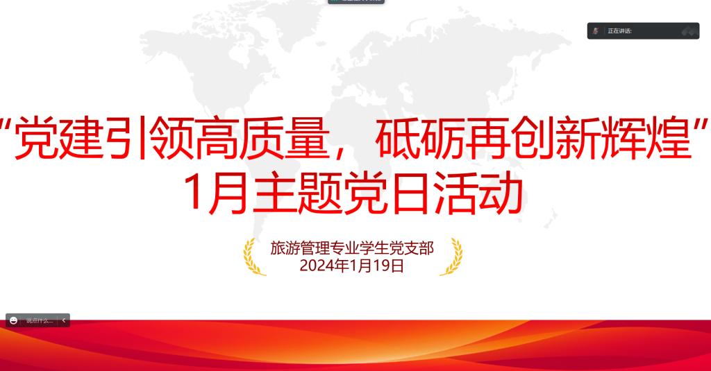 1月19日,旅游管理专业学生党支部在腾讯会议开展了主题为“党建引领高质量,砥砺再创新辉煌”的党日活动。支部全体党员参加了本次活动,活动由支部书记秦双飞主持。
