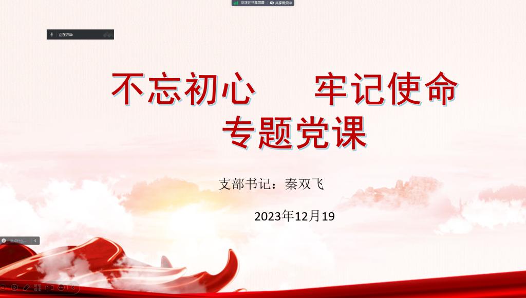 2023年12月19日,旅游管理专业学生党支部在线上开展了以“不忘初心、牢记使命”为主题的专题党课。党支部书记秦双飞担任主讲,支部全体党员参加了会议。