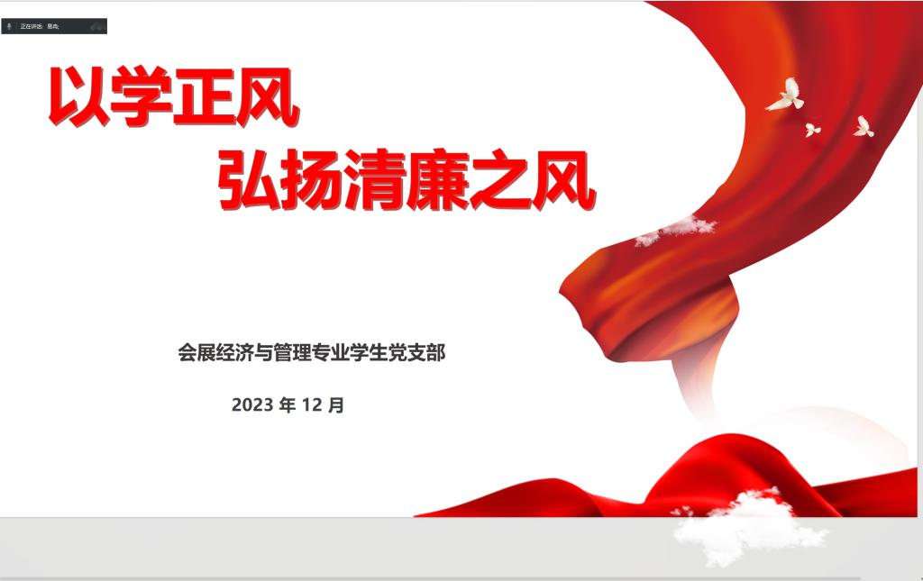 12月26日,会展经济与管理专业学生党支部线上开展“以学正风,弘扬清廉之风”12月主题党日活动。会议由支部书记易冉主持,支部全体党员参加了本次会议。