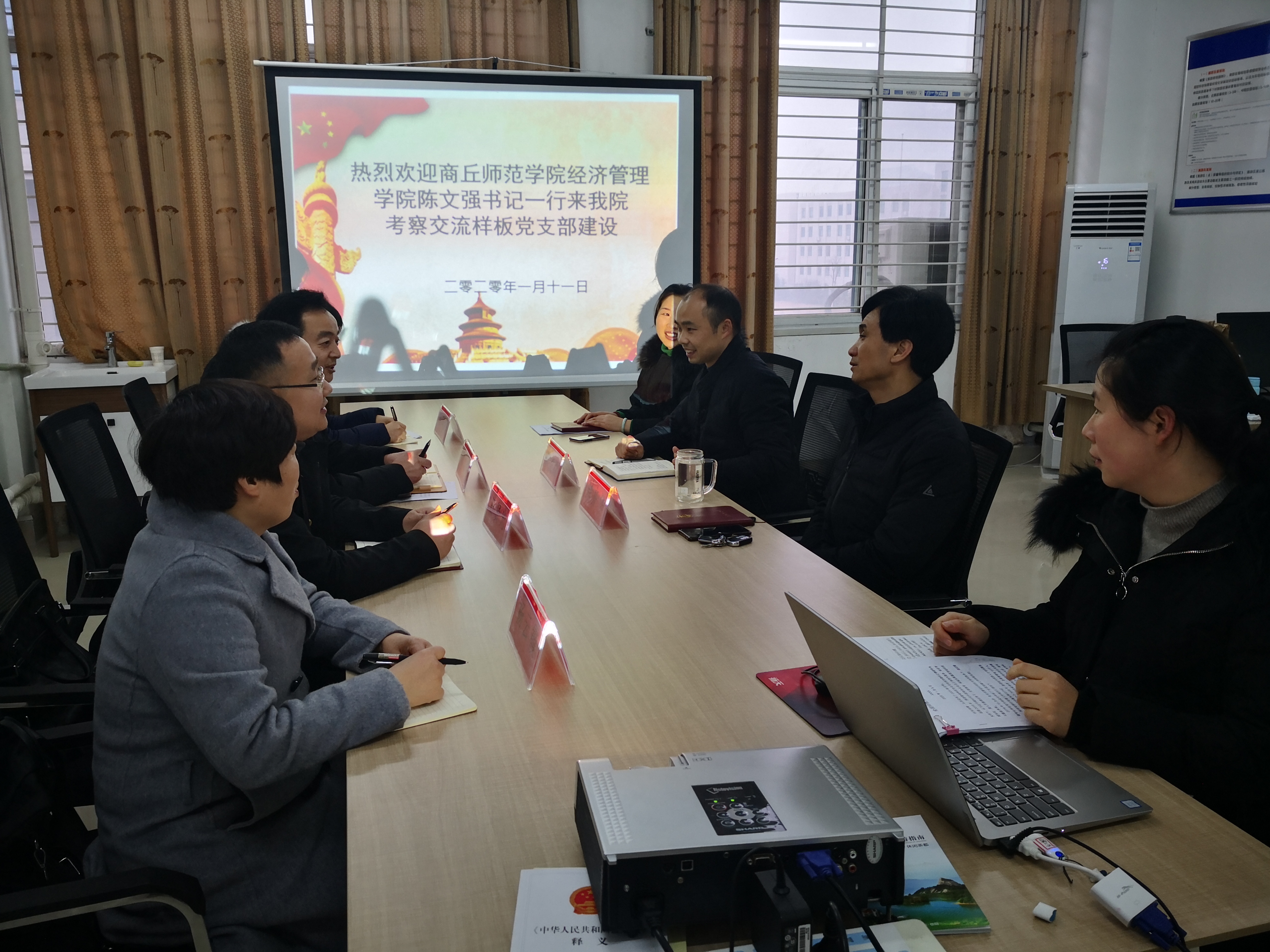 1月13日上午,商丘师范学院经济管理学院党总支书记陈文强一行4人,莅临我院考察交流样板党支部建设工作。旅游管理学院院长刘开华、党总支书记陈建国、党总支副书记杜丽、党支部书记周诗涛参加了座谈交流。